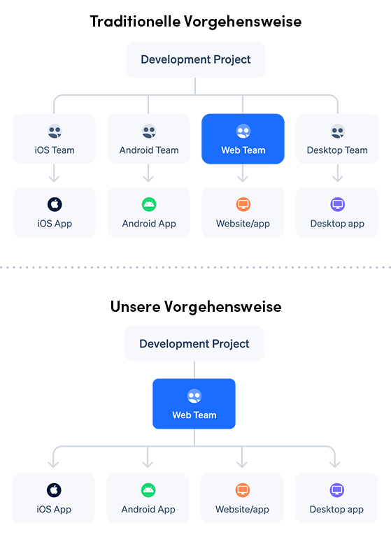 Um die Entwicklung von Apps zu beschleunigen und kostengünstiger zu gestalten, bedienen wir uns den neuesten und revolutionärsten Technologien, die sich derzeit am Markt befinden. Apps werden dabei nicht mehr zu 100 % in den altbekannten Programmiersprachen geschrieben, sondern teils mit Webtechnologien umgesetzt. Dies hat den großen Vorteil, dass aus einem einzigen Quellcode zeitgleich Apps für iOS und Android hergestellt werden können, ohne Verluste bei der Qualität oder Geschwindigkeit hinnehmen zu müssen. Solche Apps bezeichnet man als Hybrid-Apps.