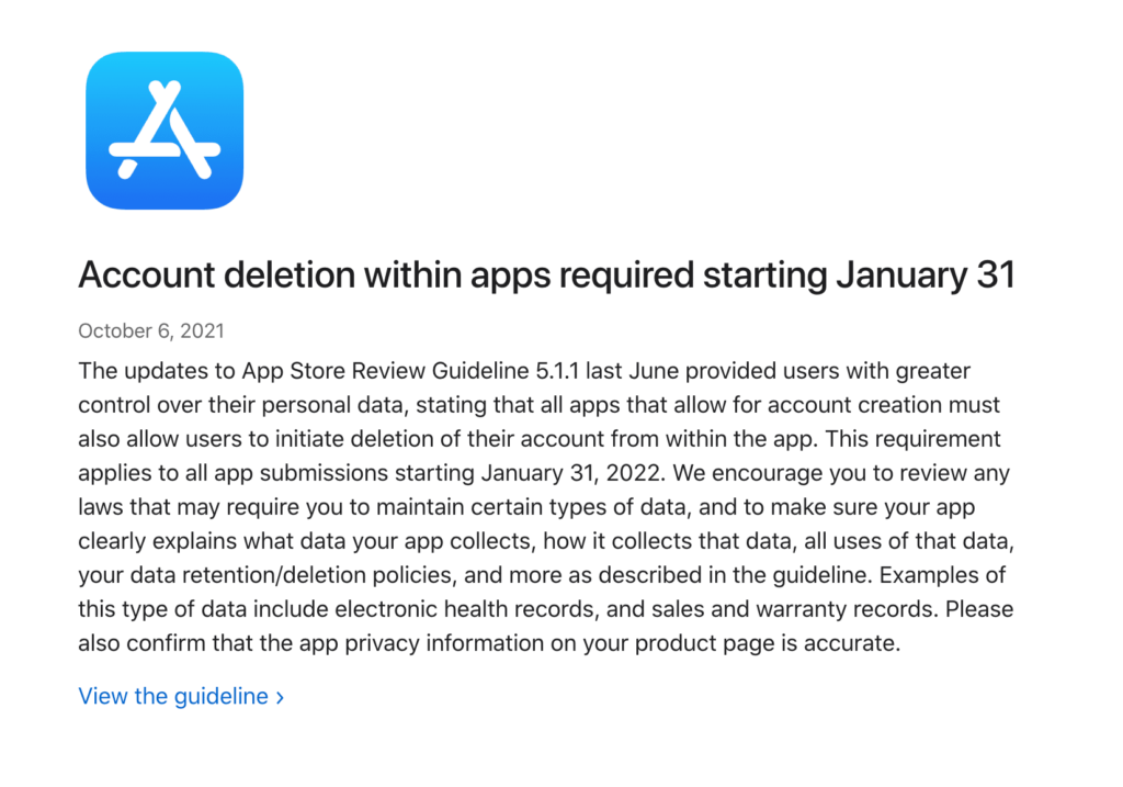 In einer Meldung informiert Apple alle Entwickler:innen über anstehende Änderungen, welche besagen, dass für alle Nutzer:innen die Möglichkeit bestehen muss, alle mit einem Nutzer:innenaccount Daten direkt aus der jeweiligen App rauszulöschen. Diese Funktion muss sich in allen Apps befinden, welche ab dem 31. Januar 2022 eingereicht werden. Dies gilt auch für Updates! Apps welche diese Funktion nicht unterstützen, werden nicht akzeptiert. Außerdem fordert Apple, dass alle Nutzer:innen transparent über die Nutzung ihrer Daten aufgeklärt werden müssen. Beispiele für diese Art von Daten seien elektronische Gesundheitsdaten sowie Verkaufsdaten und Informationen zur Garantie von Produkten.