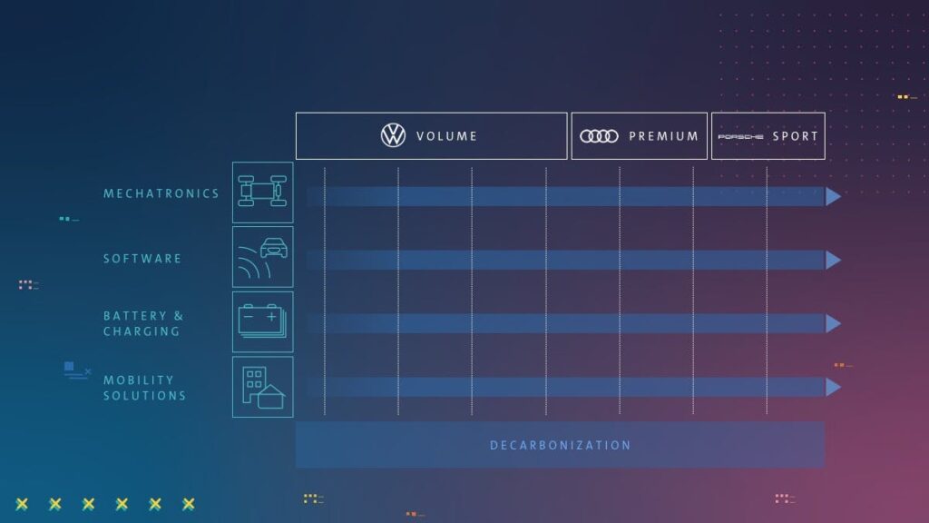 VW möchte vier einheitliche Plattformen etablieren, um seine Größenvorteile, bedingt durch die weiteren Marken wie Audi und Porsche, besser ausschöpfen zu können. Die Plattformen bestehen aus Mechatronik, Software, Batterien und Mobilitätslösungen. Die einzelnen Töchter des Konzerns sollen sich später aus diesen Elementen bedienen und spezifische Varianten auf diesen aufbauen können.